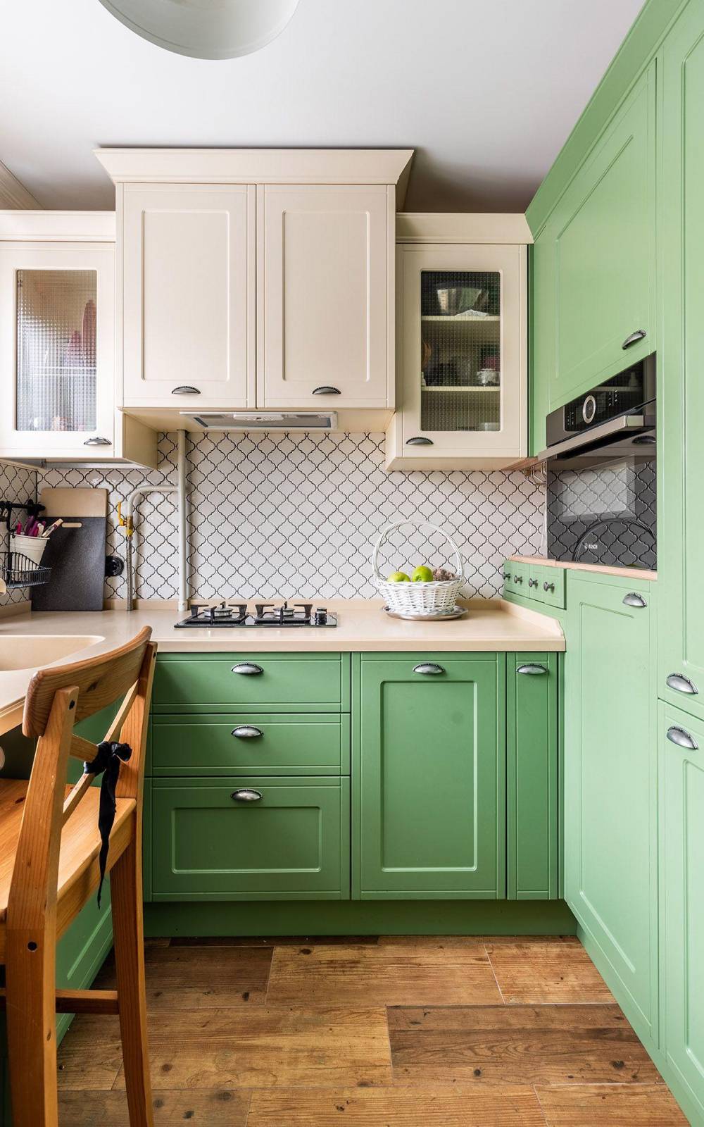 • Белый. Еще один компаньон для оливкового. Этот микс – одно из наиболее ярких сочетаний, придающих интерьеру свежести и актуальности. Сочетание этих двух цветов возможно как в равных долях, так и с преобладанием одного из оттенков. К примеру, в интерьере отлично сочетаются белоснежная столешница, светлый фартук или стены с нежно-фисташковой мебелью.
