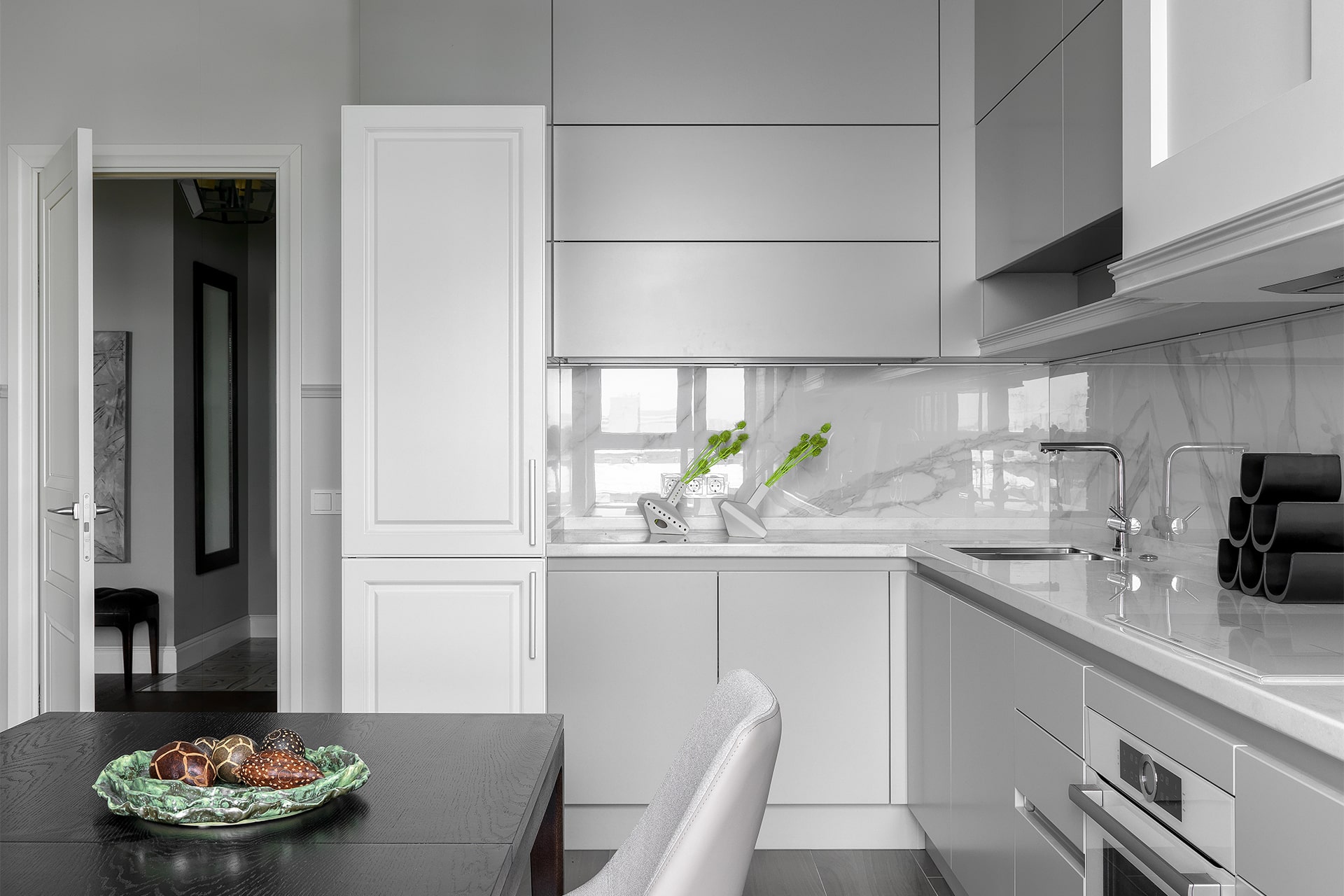 • Наиболее очевидный парный цвет для серой кухни – белый. Он точно так же нейтрален и универсален, а классическое сочетание «белый верх, темный низ» можно варьировать, тем самым получая нестандартное дизайнерское решение. Грамотно подобранная по стилю и оттенку, кухня серого цвета в интерьере будет выглядеть особенно удачно. Встречаются и бело-серо-черные варианты. Трехцветная обстановка делает помещение ярче, динамичнее и эффектнее.