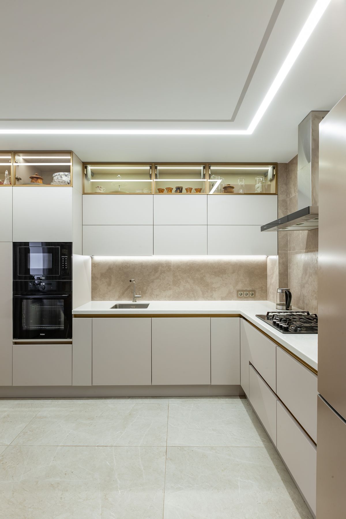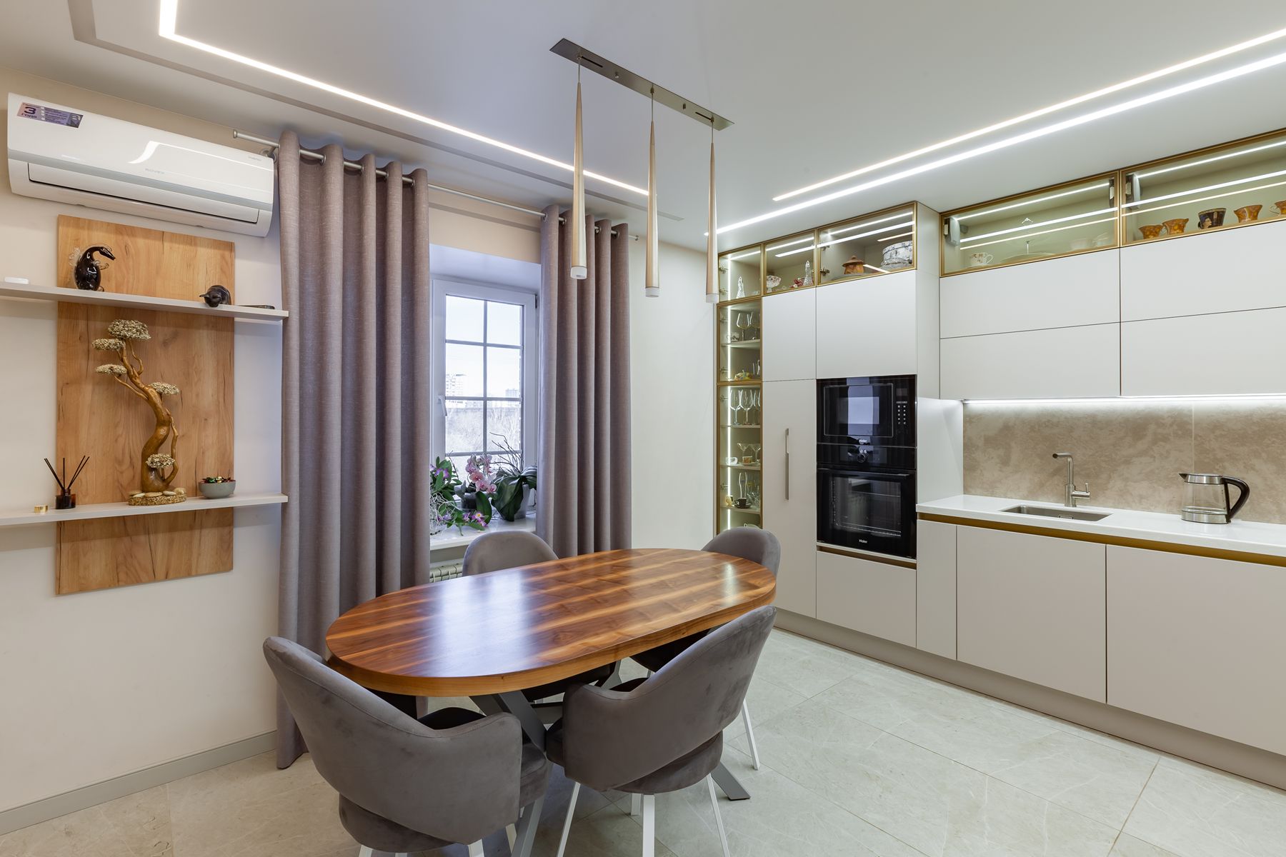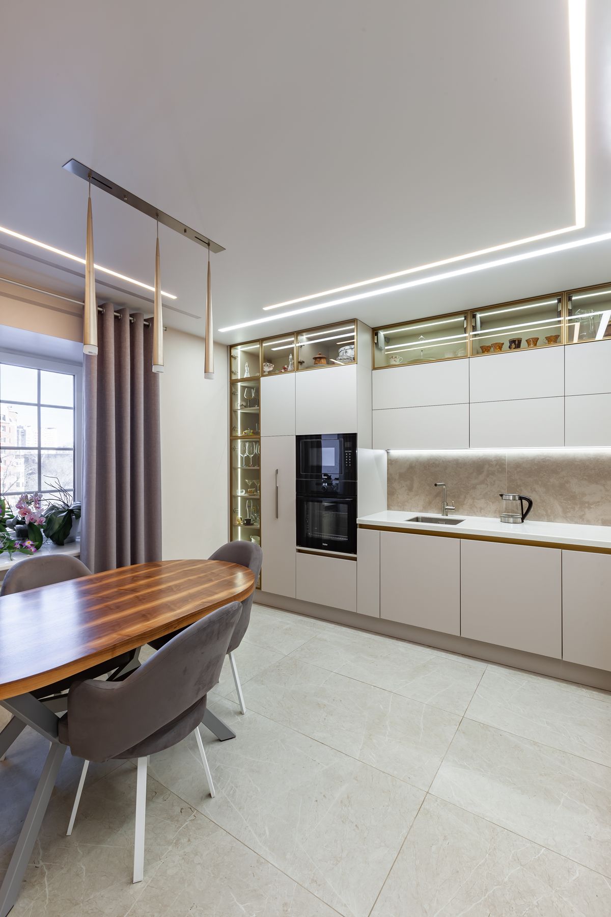 Угловая кухня: стеклянная витрина, подсветка, обеденный стол