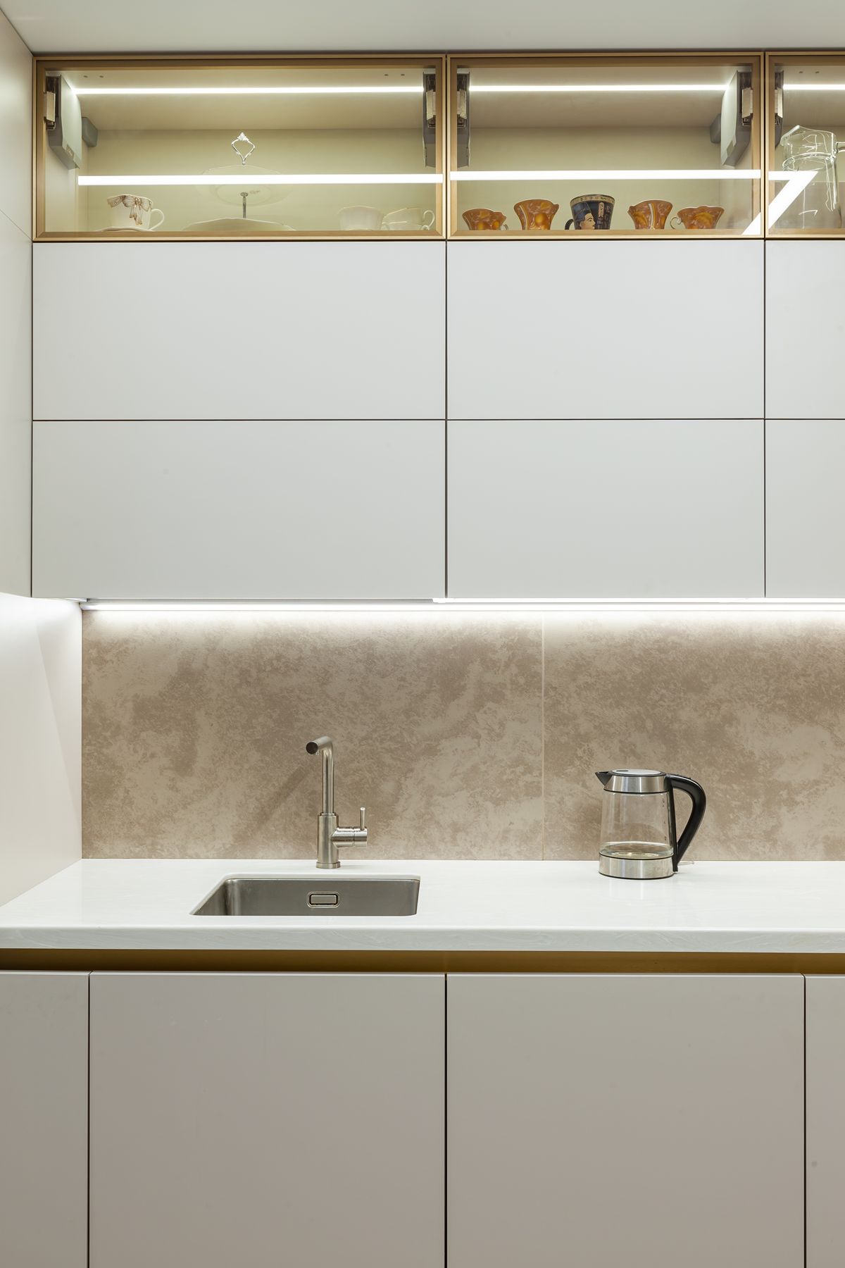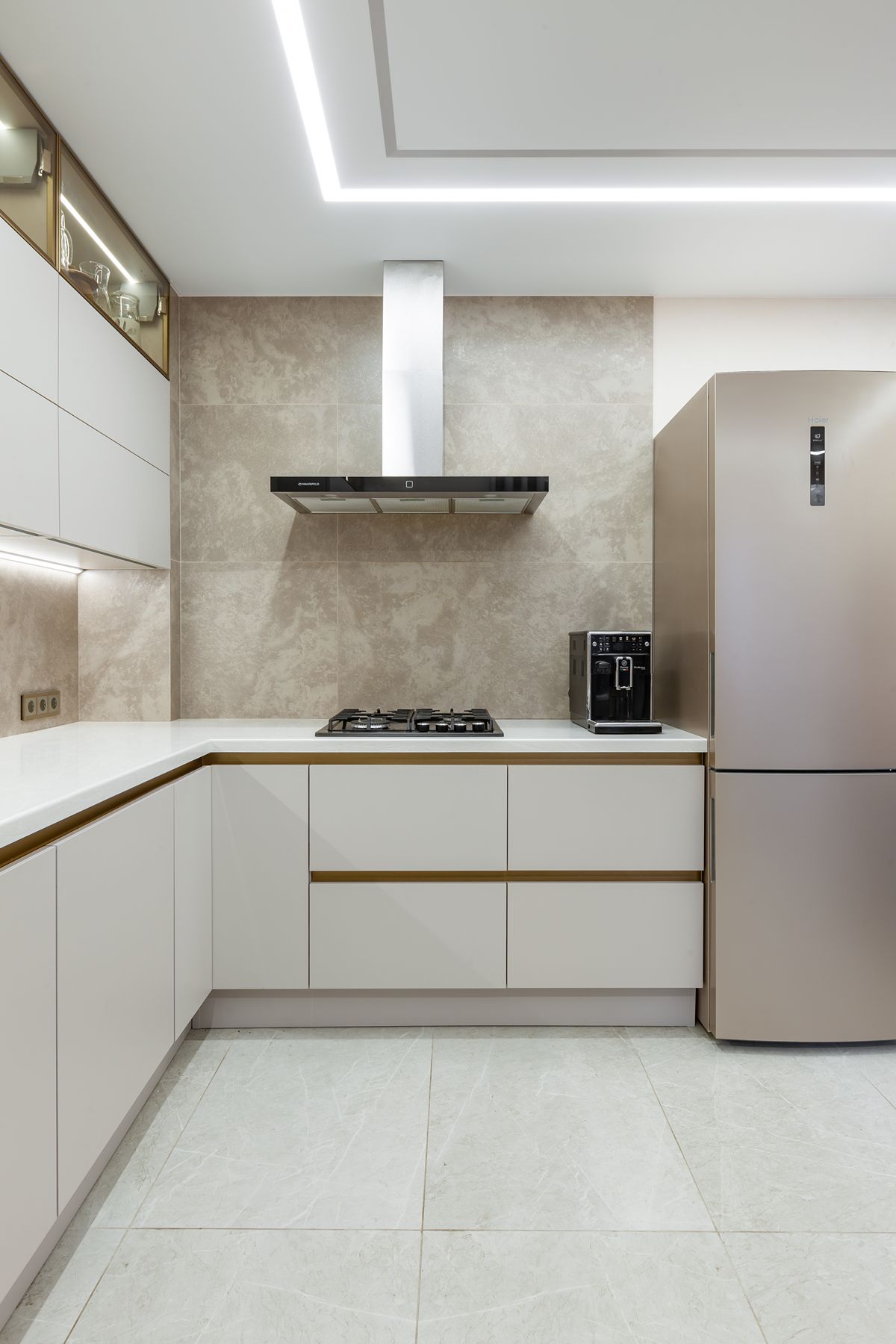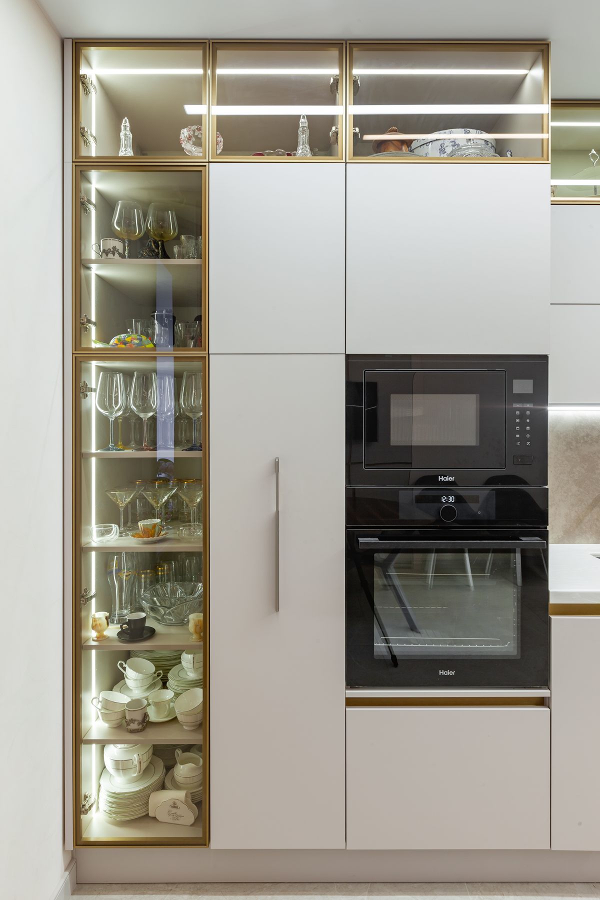 Угловая кухня: стеклянная витрина, подсветка, обеденный стол